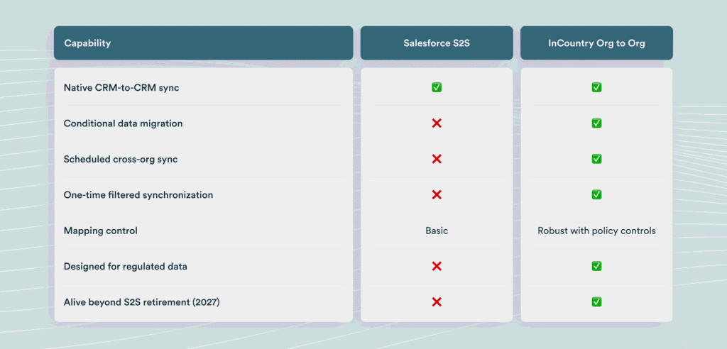 InCountry O2O is a strong alternative because it’s built for the future: supporting conditional migrations, respecting jurisdictional data laws, and enabling enterprises to maintain control over CRM data flows long after Salesforce’s legacy sync is gone.